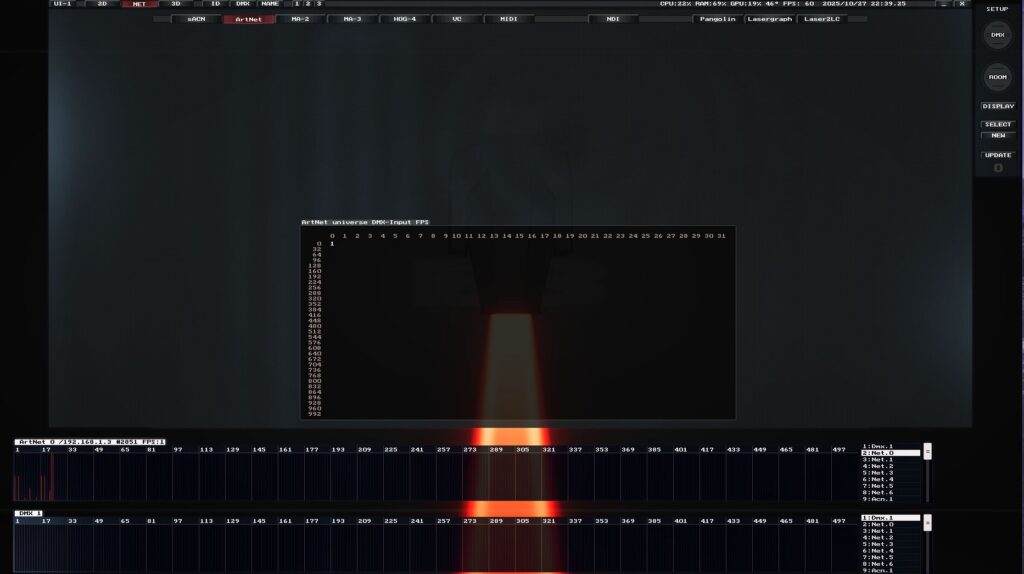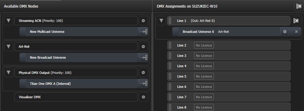 左ウィンドウのArt-Net New Broadcast UniverseをLine 1(Out: Art-Net0)に設定